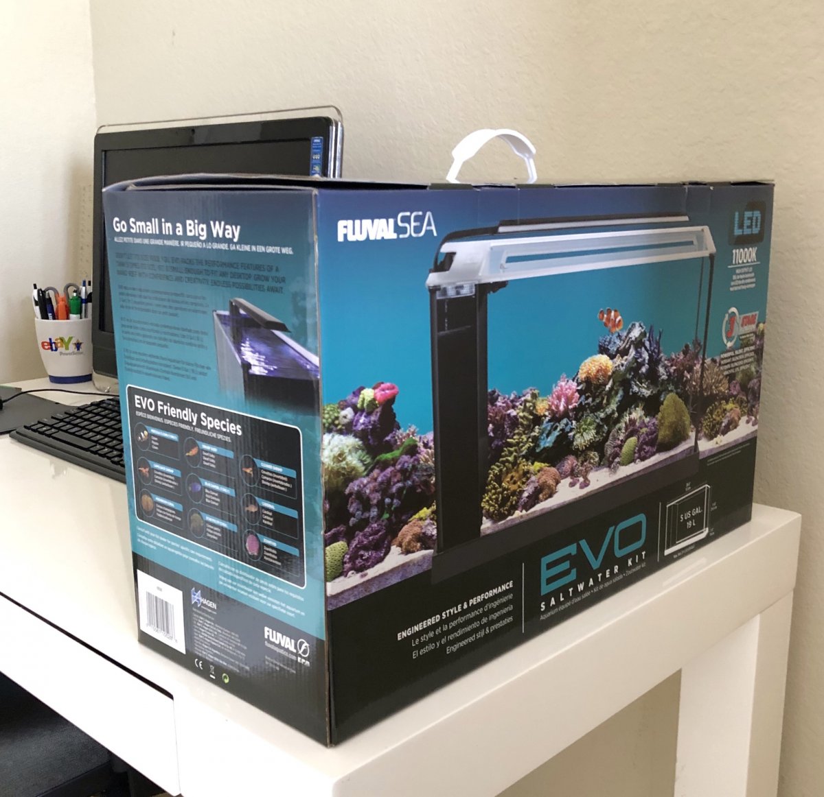 The all new evo nano saltwater kit packs the same performance features as a marine reef tank several times its size but at just 13 5 gallons is small enough to fit on most desks or countertops.